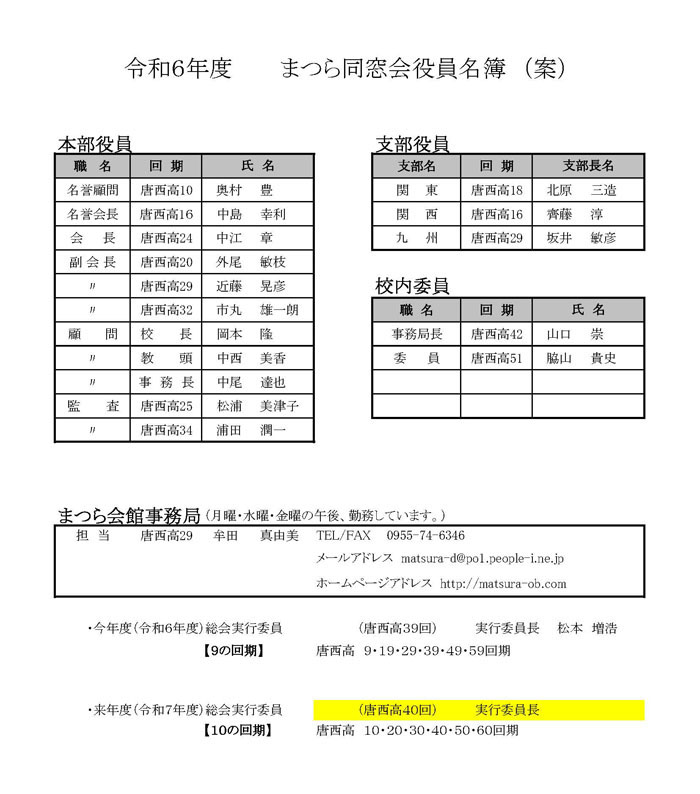 平成31年度のまつら同窓会役員名簿です。(敬称略)